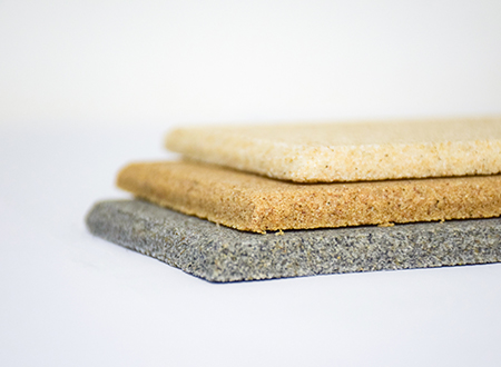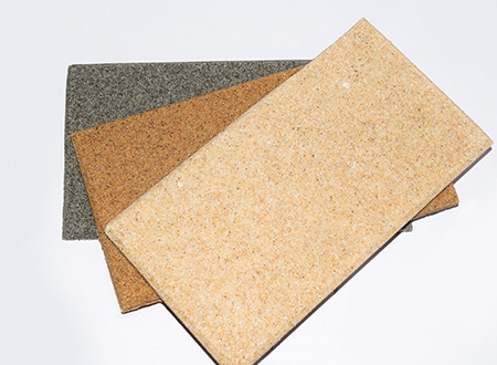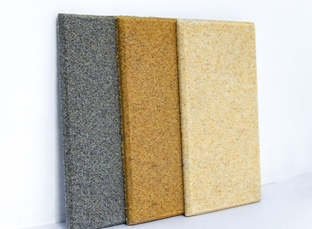 微粒材料是一種新型綠色裝飾材料,具備優(yōu)異的聲學性和物理性能。該材料是以天然砂粒或經(jīng)環(huán)保處理的固廢顆粒為骨料,以環(huán)保膠凝劑,通過壓振工藝,生產(chǎn)的具有大量相互連通的微小空隙的多孔材料。
